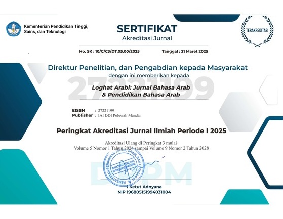 Loghat Arabi Journal accredited by Ministry of Education, Culture, Research, and Technology, Republic of Indonesiais Rank 3 (SINTA - Science and Technology Index 3) VOL 6, NO 1 (JUNI 2025): LOGHAT ARABITable of ContentsArticles